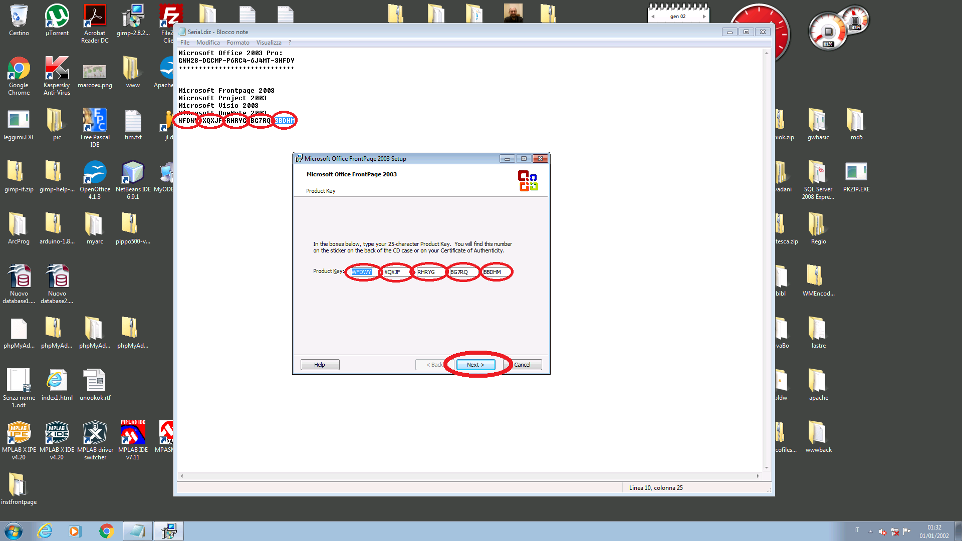 della slide Product Key i codici che avevamo aperto precedentemente