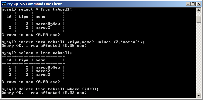 ed infine rivisualizziamo il contenuto della tabella sempre con select.
