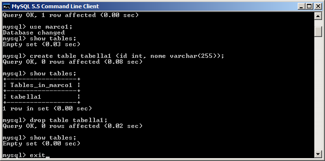 3)cancellare una tabella creata precedentemente "drop table nome_tabella;"
