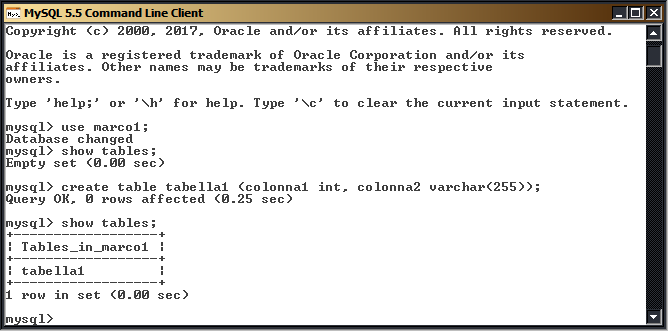 create table tabella1 (colonna1 int, colonna2 varchar(255));